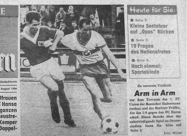 Proprio a Rostock, il 6 agosto 1966, l’Union Berlin fece il suo debutto assoluto nella stagione 1966-1976 di Oberliga. Qui il racconto si trasforma in romanzo, assume contorni mitici, e, perché no, anche un po’ fantozziani. Sotto una fitta pioggia e dopo pochi istanti dal fischio di inizio, il libero della squadra berlinese, Wolfgang Wruck, detto Ate, si scontrò duramente contro un avversario in un duello aereo. Infortunato, uscì dal campo, ma non essendoci ancora le sostituzioni, dopo cinque minuti passati a bordo campo decise comunque di continuare a giocare. E qui avvenne l’imponderabile: al 17’, appena oltre la metà campo, Wruck lasciò partire un tiro (o forse un cross) verso la porta avversaria, il portiere scivolò a causa del campo bagnato e non riuscì ad alzarsi in tempo. La sfera si insaccò in rete. Tra il comico e il grottesco, il giorno dopo, i giornali di Rostock attribuirono il gol a Prüfke. Il match, poi, finì 1-1 e l’Union Berlin chiuse la sua prima stagione con un ottimo sesto posto.
