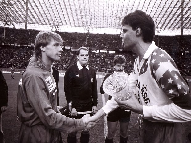 Sul campo, l’Hertha vinse 2-1 e l’ironia e il destino anche quel pomeriggio si divertirono a incrociare storie e coincidenze: ad aprire le marcature, infatti, fu Axel Kruse, ex attaccante dell’Hansa Rostock che l’8 luglio 1989, approfittando di un’amichevole della sua squadra a Copenaghen, scappò dalla DDR per rifugiarsi in Germania Ovest e si accasò proprio nell’Hertha. Nel tripudio generale delle tifoserie, il gol del pareggio dell’Union fu un momento toccante e da pelle d’oca: alla rete di André Sirocks, la prima storica marcatura della squadra dell’est su un campo fuori dai confini della Repubblica Democratica tedesca, anche i calciatori della squadra rivale si fermarono ad applaudire. Per finire, la rete del definitivo 2-1 fu segnata da René Unglaube, un ex-eisern con gli abiti blau-weiß (blu e bianchi). Dei suoi pochi, ma micidiali gol ne abbiamo parlato qui.