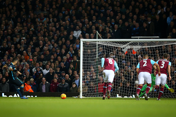 during the Barclays Premier League match between West Ham United and Manchester City at the Boleyn Ground on January 23, 2016 in London, England.
