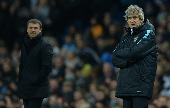 Dynamo Kiev's coach Serguey Rebrov (L) and Manchester City's Chilean manager Manuel Pellegrini watches their players from the touchline during a UEFA Champions League last 16, second leg football match between Manchester City and Dynamo Kiev at the Etihad Stadium in Manchester, north west England, on March 15, 2016. The match ended in a draw. / AFP / OLI SCARFF (Photo credit should read OLI SCARFF/AFP/Getty Images)