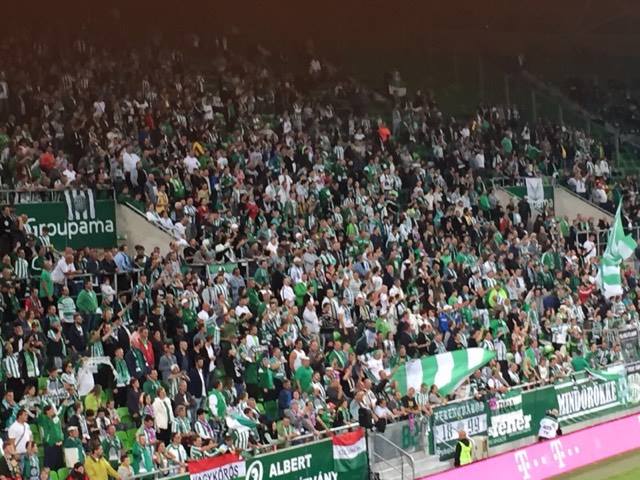 I tifosi ospiti sono perfettamente schierati nel settore a loro riservato, i gruppi ultrà di Újpest si sono mobilitati come si conviene per il primo derby della stagione. Non c’è traccia, semplicemente, di tifosi viola nelle altre tribune, così come non c’è traccia della “B Közep”, la “Tribuna B”. Questa è una storia che vale la pena di raccontare: fin dal 1928 la vecchia “Tribuna B” dello stadio di Üllöi út (il Fradi gioca qui, ininterrottamente, dal 1911) fu riconosciuta come cuore della tifoseria del Ferencváros, che vanta, in un certo senso, il tifo organizzato più vecchio del mondo. I nonni degli odierni ultrà, che hanno nomi truci come Green Monsters, Stormy Scamps, sigle conosciute e temute in mezza Europa, dovevano essere molto diversi dai facinorosi nipotini: tant’è che la costruzione del nuovo stadio ha dato al club l’occasione di provare a dare una regolata al proprio tifo, spesso causa di multe e squalifiche del campo con conseguenti danni economici e di immagine.