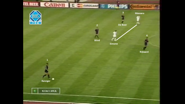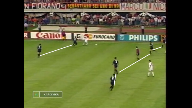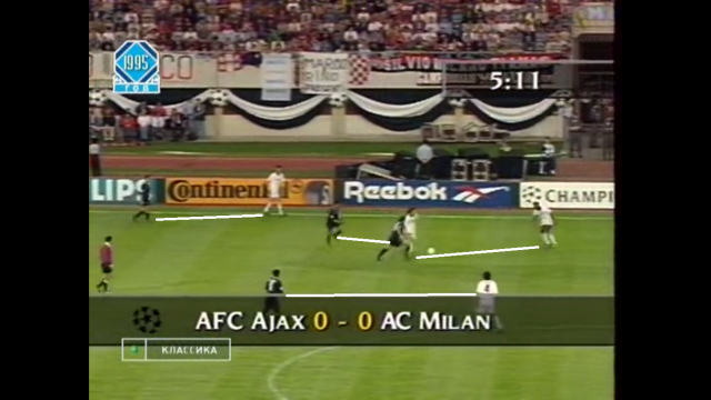 L’esempio in questo caso lo preleviamo dalla rete che ha deciso quella finale di Champions, messa a segno da Patrick Kluivert. Dopo il classico giro-palla guidato magistralmente da Rijkaard, arriva il cambio gioco sulla fascia di Overmars, il quale allarga notevolmente le maglie della difesa milanista. L’esterno olandese appoggia il pallone all’accorrente Davids (ricordate la filosofia del triangolo?), che a sua volta lo serve diligentemente a Rijkaard. Ed è qui che arriva il famoso colpo di genio, la giocata creativa che risolve ogni rompicapo: passaggio filtrante a servire il giovanissimo Patrick Kluivert, il quale supera il contrasto di Boban ed infila Seba Rossi con una zampata. Scacco matto e coppa dalle grandi orecchie portata a casa!