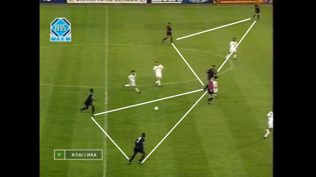 Questo rispecchia anche uno degli aspetti tattici fondamentali del calcio disegnato da Van Gaal, ovvero essere in superiorità numerica nella propria trequarti per disimpegnarsi al meglio sul pressing avversario, che di solito è basato esclusivamente sul lavoro delle due punte. In questo caso si viene a creare un vantaggioso quattro contro due, che rende la vita facile ai possessori del pallone e nel contempo permette anche il passaggio con poche difficoltà della prima linea avversaria. Da qui poi parte la manovra della squadra dei “lancieri”, che comincia a far girare la palla in attesa del varco giusto per poter trovare la via della rete. Nella trama di gioco costruita da Van Gaal, uno degli elementi importanti è sempre la formazione di triangoli. In questo modo la palla gira sempre più velocemente e il portatore di palla ha sempre minimo due soluzioni su cui appoggiarsi. Nell’esempio portato qui sotto, Rijkaard può giocare il pallone a Seedorf o Finidi (gli altri due vertici del triangolo in basso), oppure può anche ribaltare il lato alla ricerca di Davids e Overmars (vertici del triangolo alto).
