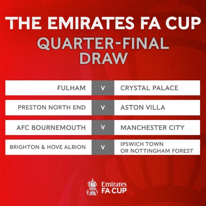 L’ultimo accoppiamento vede il Brighton aspettare l’esito del replay tra Nottingham Forest e Ipswich. Dopo aver eliminato il Newcastle agli ottavi, i Seagulls puntano a prolungare il loro percorso in una competizione che potrebbe regalare loro una storica semifinale.