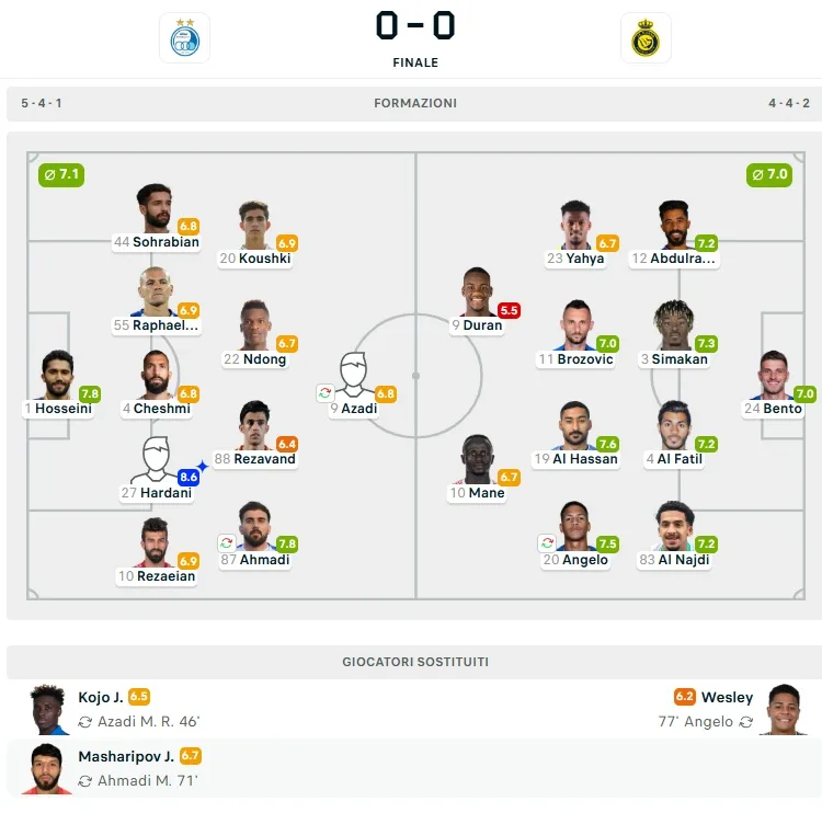 Una notte di attese disilluse all’Azadi Stadium di Teheran, dove l’Al Nassr ha dovuto accontentarsi di un pareggio senza reti nell’andata degli ottavi di finale dell’AFC Champions League Elite. L’assenza di Cristiano Ronaldo, rimasto a Riyadh per riposare dopo la recente sconfitta in campionato, ha pesato più del previsto.