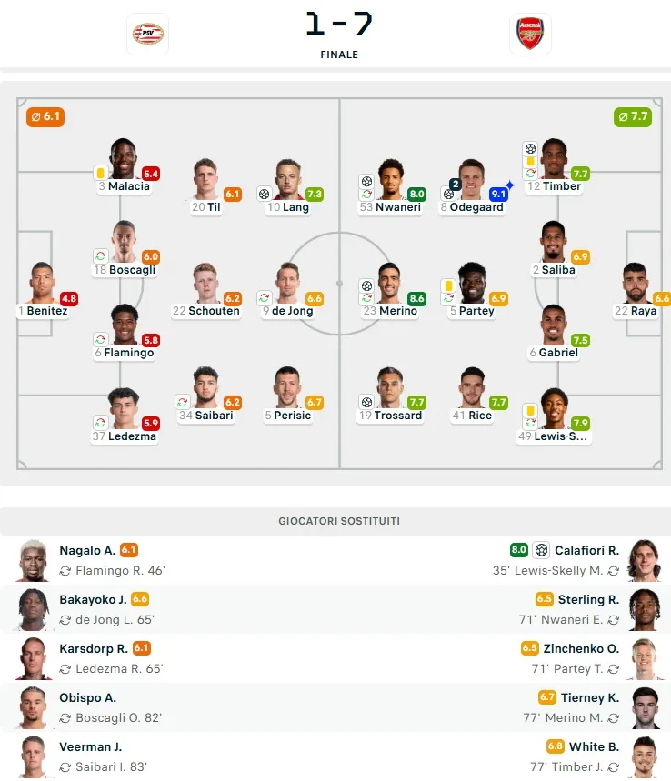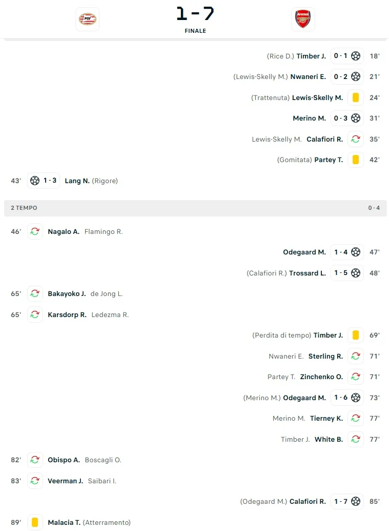 Chi si aspettava una ripresa più equilibrata è rimasto deluso. L’Arsenal ha ripreso a macinare gioco con la stessa ferocia del primo tempo. Al 47’ è arrivato il poker con il primo sigillo della serata di Martin Odegaard, lesto a sfruttare un rimpallo in area. Il PSV, incapace di reagire, ha continuato a incassare, e al 61’ è stato Leandro Trossard ad aggiungere il quinto gol, ben servito da Riccardo Calafiori.