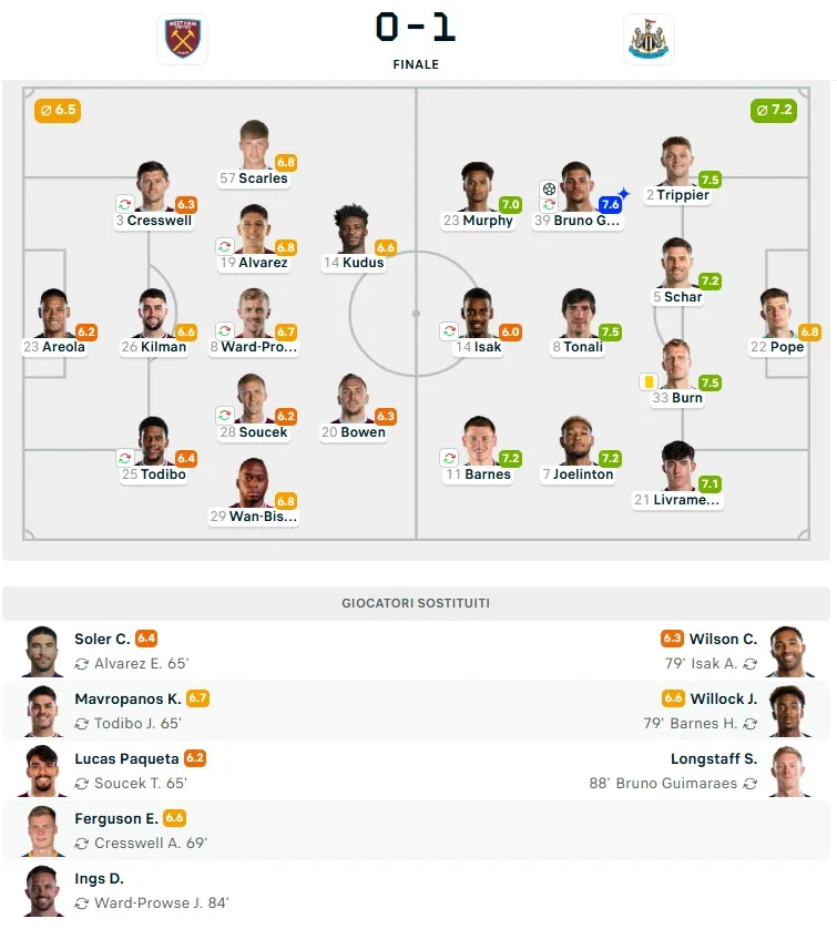 Nonostante il dominio territoriale, il Newcastle non riesce a concretizzare. Harvey Barnes ci prova due volte, ma trova la pronta risposta di Alphonse Aréola. La nota stonata per i bianconeri è la serata anonima di Alexander Isak, poco incisivo e mai davvero pericoloso.