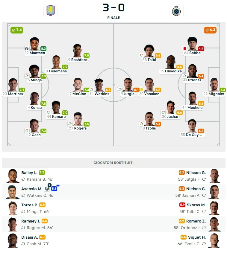 Il Brugge accusa il colpo e il Villa ne approfitta per chiudere i conti. Ian Maatsen insacca il raddoppio su assist di Morgan Rogers, poi è ancora Asensio a mettere la firma sul 3-0 con un facile tap-in dopo un’iniziativa di Rashford sulla sinistra. Tre gol in un quarto d’ora e partita archiviata con largo anticipo.