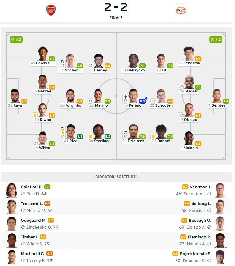 L’Arsenal esce dalla serata con la consapevolezza di poter gestire anche le partite meno brillanti. Il PSV, nonostante il pareggio, paga l’umiliazione subita all’andata e si ferma qui.