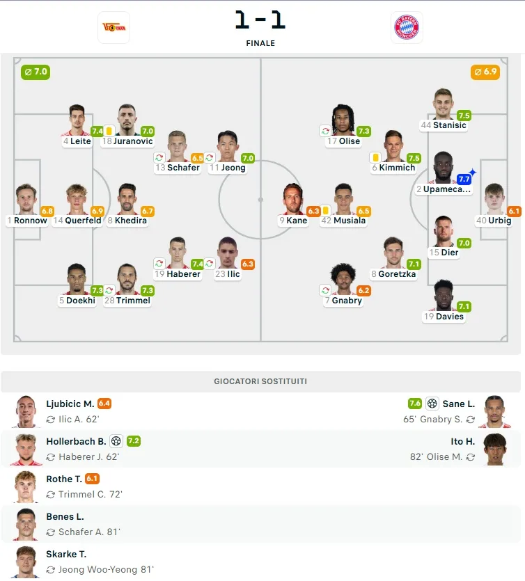 Con il vantaggio in tasca, ai bavaresi sarebbe bastato controllare il finale di gara. Ma una leggerezza del portiere Sven Ulreich ha rovinato tutto. Un’uscita imprecisa ha consegnato il pallone sui piedi di Hollerbach, che di testa ha firmato l’inaspettato pareggio a sette minuti dal termine. Il Bayern ha provato l’assalto finale, ma l’Union ha resistito fino al triplice fischio.