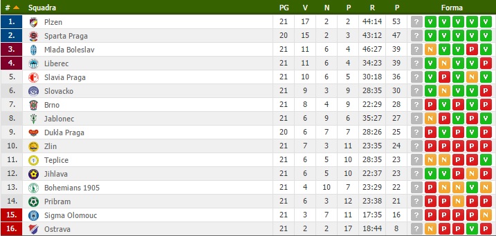 In coda è sempre bagarre: il fanalino di coda Banik Ostrava riesce a portar via un punto da Jablonec con un buon 1 a 1 (reti di Vrastil per gli ospiti al 30′ e Dolezal al 36′), graziato dall’ex Plzen Tecl che fallisce nella ripresa il calcio di rigore concesso ai padroni di casa. Il Sigma Olomouc mantiene il penultimo posto, frutto di una stagione stranissima con buoni risultati in Europa League e il serio rischio di retrocedere in Druha Liga, la seconda divisione ceca, in campionato. Intanto il Vysocina Jihlava approfitta delle sconfitte di Marila Pribram e Bohemians 1905 e espugnando il Juliska Stadion di Praga supera le dirette concorrenti portandosi a 7 lunghezze di vantaggio dalla zona pericolosa. Il Dukla, alla settima sconfitta stagionale, continua a mancare in continuità alternando ottime prestazioni ad altre deludenti.