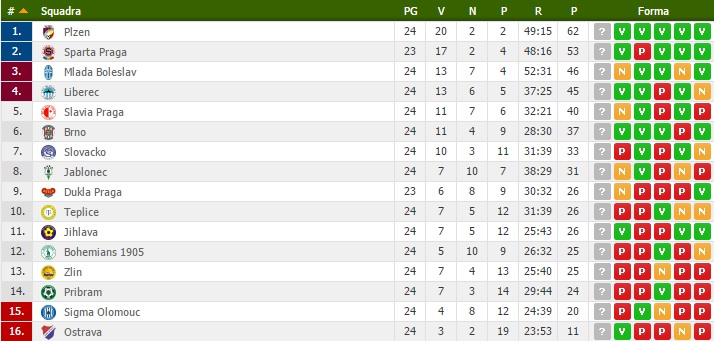 Non cambia nulla in Synot Liga. Nel 24° turno resta invariata la distanza in testa tra Viktoria Plzen e Sparta Praga: entrambe le formazioni sono infatti riuscite a portare a casa i tre punti, pur con qualche sofferenza, riuscendo a rimontare lo svantaggio iniziale, rispettivamente contro lo Zlin e il Marila Pribram. Le due big vanno sotto nel primo tempo per poi ribaltare il risultato nella ripresa grazie a Petrzela-Vanek da una parte e Dockal-Lafata dall’altra. A sei turni dal termine, ma con lo Sparta che deve ancora recupare il derby con il Dukla Praga, i potenziali 6 punti di vantaggio permettono al Viktoria Plzen di affrontare con tranquillità i prossimi match. Non è però da escludere che in caso di uscita dall’Europa League, la formazione granata guidata da Scasny possa inanellare una serie di vittorie consecutive e rifarsi sotto nel rush finale di campionato.