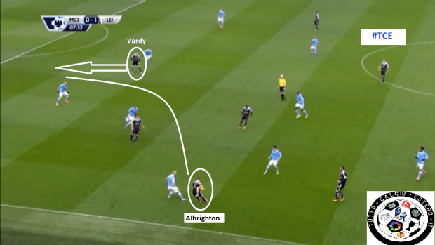 Un altro movimento che ha contraddistinto la stagione di Vardy è stato l’attacco della profondità, con cui molte volte ha messo in difficoltà le difese avversarie. Stavolta la partita di riferimento è quella tra Manchester City e Leicester, uno dei grandi upset delle “Foxes”, che espugnarono l’Etihad Stadium con il punteggio di 1-3. In questo caso vediamo il pallone in possesso di Albrighton, il quale alza la testa e senza pensarci due volte scodella il pallone in profondità per il taglio di Vardy. Il centravanti del Leicester è bravo nel prendere il tempo ad Otamendi (in netto ritardo nell’occasione) e ad aggredire immediatamente lo spazio andando a tu per tu con Joe Hart. In questo caso da sottolineare anche l’errato movimento di Otamendi, che si addormenta per un attimo e si dimentica fatalmente di scalare a uomo su Vardy; infatti in questo caso Zabaleta era in marcatura su Albrighton e Demichelis era scalato puntualmente per coprire lo spazio lasciato indifeso dal compagno di reparto.