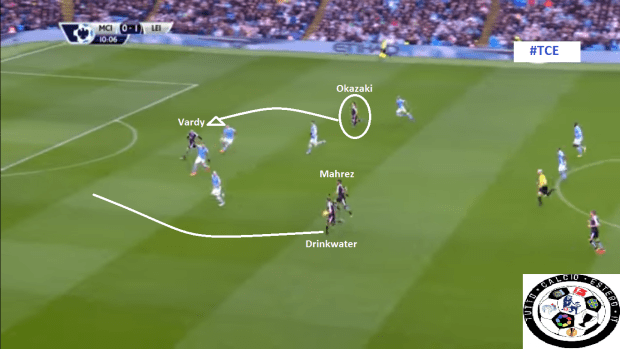 L’ultima istantanea è dedicata ad una delle armi principali di questo Leicester, ovvero le giocate di rimessa, infatti Ranieri ha costruito nelle ripartenze uno dei punti di forza della sua creatura vincente. Prendendo come punto di riferimento sempre il match tra Manchester City e Leicester, qui sopra è ben disegnata il contropiede tipo delle Foxes: in pratica si assiste quasi ad una staffetta 4×100, poiché nel momento in cui l’algerino Mahrez riprende il pallone, Drinkwater, Vardy e Okazaki attaccano immediatamente la profondità dando ben tre opzioni al portatore di palla. In questo caso il “play” algerino ha la possibilità di servire centralmente Vardy, aprire il gioco per Okazaki a destra o tagliare il pallone per l’inserimento a tutta velocità di Drinkwater; alla fine Mahrez sceglierà la terza opzione, ma comunque va sottolineato come, seppur in inferiorità numerica, il Leicester riesca lo stesso a trovare la via della porta. Importante soprattutto il lavoro di Vardy che attaccando la profondità tra i due centrali difensivi avversari, fa da specchietto per le allodole e li costringe a chiudersi a riccio aprendo il fianco agli inserimenti esterni di Okazaki e Drinkwater.