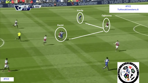 Per quanto riguarda la fase offensiva, una grossa fetta del titolo è sicuramente merito della grande vena realizzata di Jamie Vardy. Simbolo indiscusso di questo Leicester operaio, ha costruito la sua grande stagione su un movimento base per qualsiasi centravanti: ovvero il movimento fuori-linea. Un chiaro esempio è presente nell’immagine qui sopra, tratta dal match tra West Ham e Leicester del 17 Aprile (terminato con il punteggio di 2-2). In questo caso particolare prendiamo in esame l’azione dell’1-0 del Leicester, che porterà poi al gol firmato da Vardy. Tutto parte da un rilancio di Schmeichel, che serve immediatamente Mahrez per dare il via alla ripartenza; il giocatore algerino alza la testa e passa il pallone in profondità all’accorrente Kanté, che punta diritto verso la porta. Da notare il movimento di Vardy, che va sull’esterno effettuando il movimento fuori-linea e costringendo il difensore ad effettuare una scelta: o mantenenere la posizione per proteggere lo specchio della porta o decidere di andare a marcare a uomo il centravanti del Leicester.