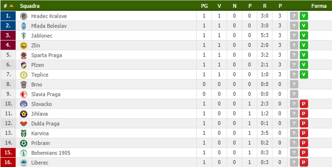 Vincono anche Mlada Boleslav, Zlin e Teplice. Quest’ultimo si aggiudica i primi punti dell’anno espugnando lo stadio del Dukla Praga grazie ad una rete di Potocny, abile ad indirizzare verso la porta un cross dalla sinistra eludendo l’intervento del portiere avversario. Il Mlada Boleslav supera agevolmente tra le mura amiche il rivale della scorsa stagione nella lotta europea, lo Slovan Liberec, con un netto 3 a 0. Tutte le reti portano la firma di Jan Chramosta, che dunque realizza il suo primo “hattrick” stagionale in campionato. Come detto in precedenza, vince anche lo Zlin, che con un rete per tempo archivia la pratica Marila Pribram. Le reti portano la firma di Hajek nei minuti di recupero del primo tempo e Jugas a 120 secondi dal 90’.