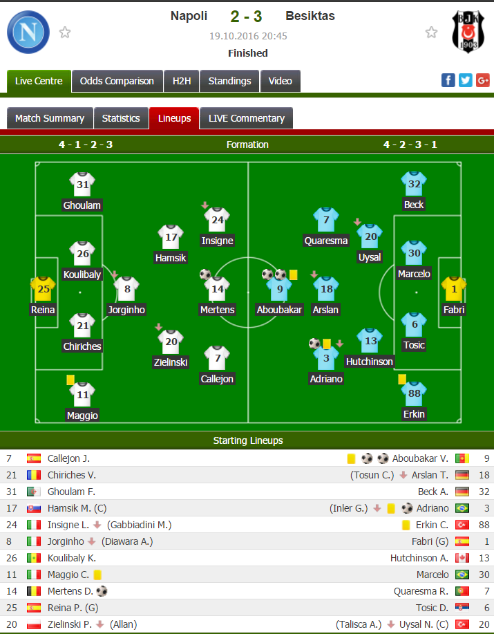Senza Gabbiadini, bocciatura clamorosa con Mertens schierato al centro dell’attacco, il Napoli parte forte e sfiora due volte il vantaggio proprio col belga. Una serie infinita di calci d’angolo (alla fine saranno 17 a 1 ma alla mezz’ora i padroni di casa avevano già abbondantemente raggiunto la doppia cifra) è intervallata dalla prima offensiva dei turchi, che passano in vantaggio. E’ Quaresma a mettere in mezzo un pallone forte e teso che taglia fuori i centrali partenopei e coglie impreparato sia Maggio (fuori posizione) che Callejon, in ritardo nel recupero: Adriano, ex Barcellona, insacca da due passi. Il Napoli non accusa il colpo e continua a macinare gioco e a creare pericoli dalle parti di Fabri. Il (meritato) pareggio arriva alla mezz’ora: Callejon è lanciato in profondità e, dopo un controllo non perfetto, riesce a crossare basso dalla destra. Mertens approfitta del buco del portiere ospite e insacca col tipico taglio sul primo palo chiesto a Sarri dai suoi centravanti. Il vantaggio, ovviamente, scuote anche il San Paolo (non pieno e piuttosto soporifero), Insigne – peggiore in campo – sfiora il gollonzo dell’anno con una conclusione da 50 metri, in realtà suggerimento per Callejon, che coglie impreparato il portiere ospite.