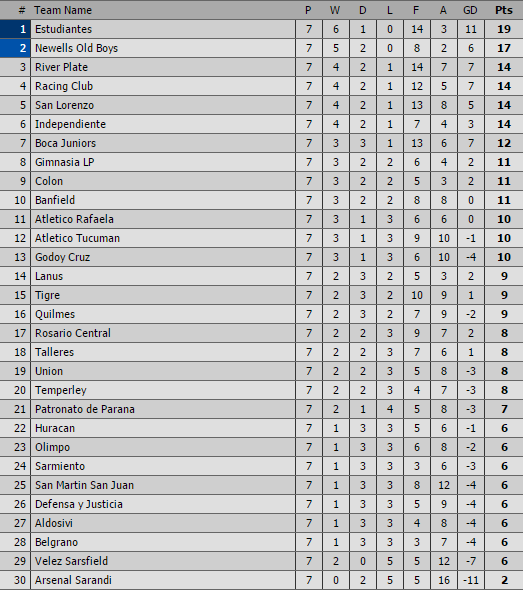 Nelle altre partite della settima giornata, il Godoy Cruz di Méndez si risolleva, e grazie a Ayovi e Correa, sconfigge con un netto 2 a 0 il Belgrano, che rimane immischiato nei bassi fondi della classifica; il Quilmes con un goal di Bottino ad inizio partita batte al “José Luis Meiszner” i campioni in carica del Lanus, rilegati a metà classifica e lontani parenti della squadra campeones dello scorso campionato; il Tallares Córdoba vince per 2 a 0 contro il Defencia y Justicia (di Palacios e Jonathan Menendez le reti della vittoria); il Sarmiento Junin pareggia in casa per 1 a 1 contro l’Olimpo (a segno Balboa per i padroni di casa, a cui risponde con un calcio di rigore di Correa); infine il Tigre di Troglio rifila un secco 3 a 1 al mal capitato Union de Santa Fé, passato in vantaggio a metà prima frazione con Britez, ma che è costretto a subire “l’ondata rosso-blu” nella ripresa, con i tre goal siglati da Godoy e Luna, autore di una fantastica doppietta.