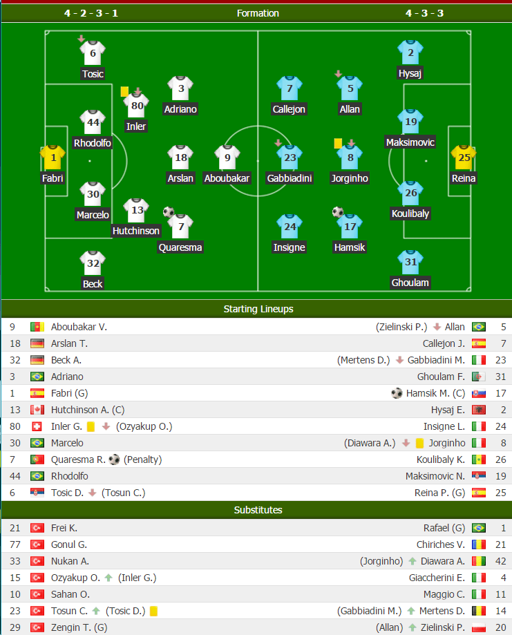 Un quarto d’ora di sofferenza, nemmeno esagerata, poi tanto Napoli. Che approfitta della serata sotto tono di Quaresma e di un paio di scelte sbagliate di Aboubakar in situazioni di potenziale pericolo per Reina. Ma che si mangia le mani per l’occasione chiarissima capitata a Callejon a inizio ripresa e per la poca scaltrezza di Hamsik e il trio d’attacco, mai capaci di sfruttare al meglio le galoppate di Ghoulam, probabilmente il migliore dei suoi e bravo a reagire dopo i disastri dello Stadium. La frittata sembrava pronta al 79′: Maksimovic è ingenuo nel tenere largo il braccio nel tentativo di chiusura sull’affondo di Aboubakar, Quaresma trasforma il giusto rigore. Turchi in festa ma che non fanno in tempo a godersi il primato provvisorio. Tre minuti dopo, infatti, il gioiello di Hamsik: sinistro dai 20 metri a giro, potenza e precisione. Fabricio non può davvero nulla. E’ il gol del definitivo 1-1, una boccata d’ossigeno. Che può salvare la stagione europea del Napoli.
