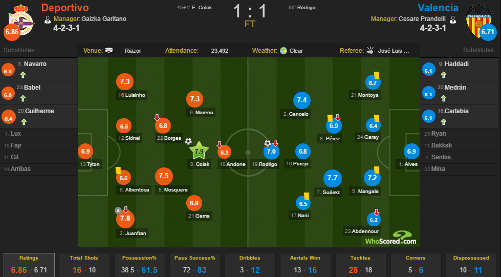 Al Riazor di La Coruña Deportivo e Valencia si dividono la posta in palio, terminando la partita sul risultato di 1-1: nel primo tempo passano in vantaggio i padroni di casa grazie al gol di Emre Colak, probabilmente il migliore in campo; nella seconda frazione di gioco, invece, è Rodrigo a trovare la rete che inchioda la sfida sul punteggio di parità. Pareggio che non serve a nessuna delle due squadre, sia il Depor che le Taronges continuano la loro stagione con l’acqua alla gola, in piena zona retrocessione ma per la squadra di Cesare Prandelli le cose sembrano iniziare a prendere una piega migliore.