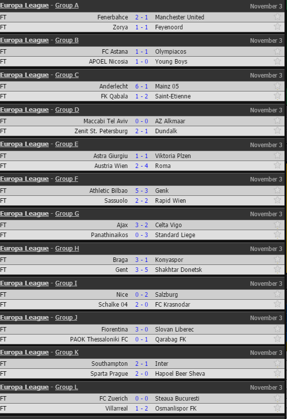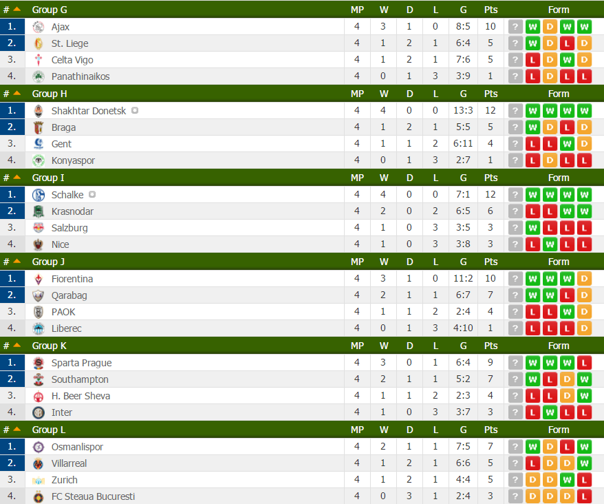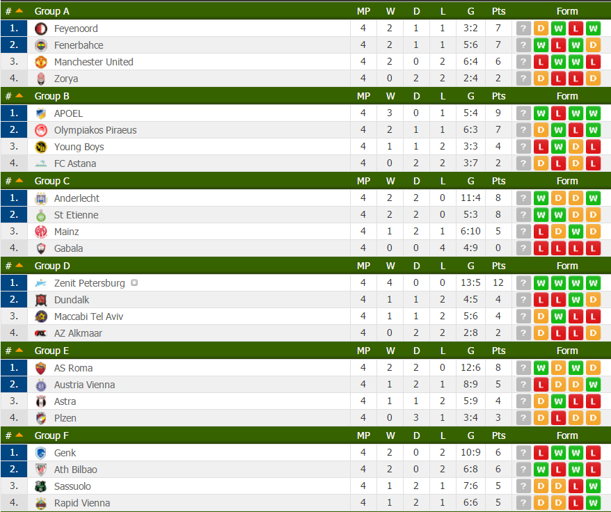 Di seguito risultati e classifica dopo la quarta giornata di Europa League.