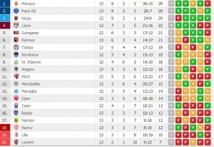 La testa della Ligue 1 diventa un discorso a tre , perché il Monaco ed il Paris Saint Germain sono adesso in testa a quota 29, insieme al Nizza che dovrà giocare domani un’importante scontro al Geoffroy Guichard, contro il Saint Etienne(21:00).