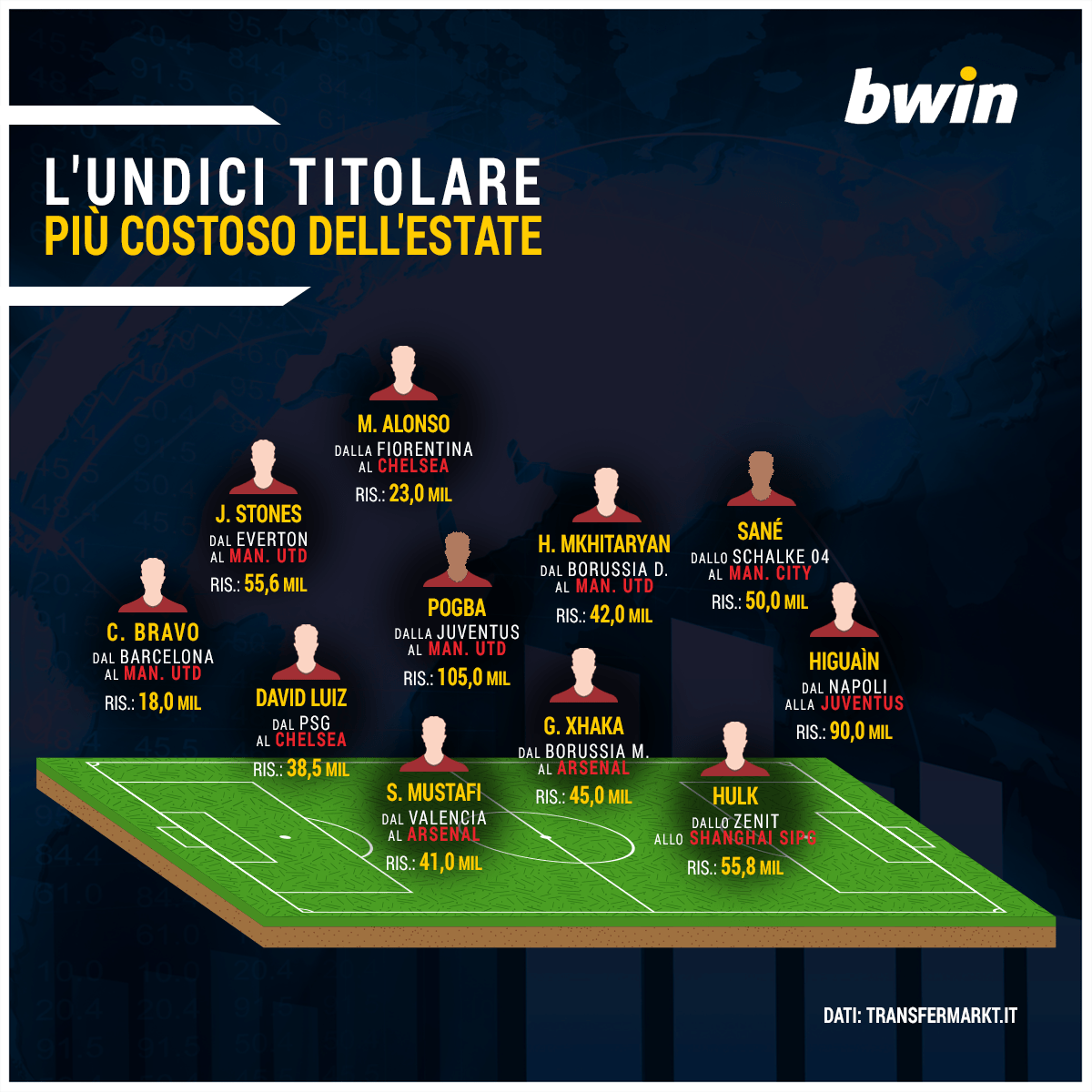 Tutto parte da Pogba, che va al Manchester United per 120 milioni e scatena una reazione domino che porterà Higuain ai bianconeri per 94 milioni. Al mondo, nessun altro giro d’affari per singoli giocatori fa registrare cifre simili, riportando l’Italia nell’olimpo delle trattative come non accadeva dall’inizio del nuovo millennio. Scorrendo la top 11 degli affari di quest’ultima estate, è incredibile il dominio inglese in ogni reparto: tutti i giocatori più pagati militano in squadre della Premier, eccezion fatta proprio per Higuain passato dal Napoli alla Juventus. Che si tratti di portieri, con l’arrivo di Bravo dal Barça al City, a quello di Sanè dallo Schalke 04 alla squadra di Guardiola: un’altra sola eccezione, il passaggio di Hulk dallo Zenit allo Shanghai.