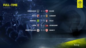 Pareggio senza infamia e senza lode per Caen e Guingamp,1-1, con la squadra di Kombouaré che si trova a pari punti proprio con il Bordeaux.Discorso similare per Montpellier–Nancy, con il Montpellier che da tempo non mostra un grande calcio nonostante la sua qualità e conclude un altro 0-0. Stesso risultato in Nantes-Lille, con il LOSC che gioca meglio degli avversari ma manca sempre di convinzione e concretezza sotto porta. Il traghettatore Collot sembra aver portato linfa fresca ed aver rimesso al centro del progetto gente qualitativamente forte come Benzia, il migliore in campo. Per Girard ed il suo Nantes la classifica non è un problema, ma il gioco sì.