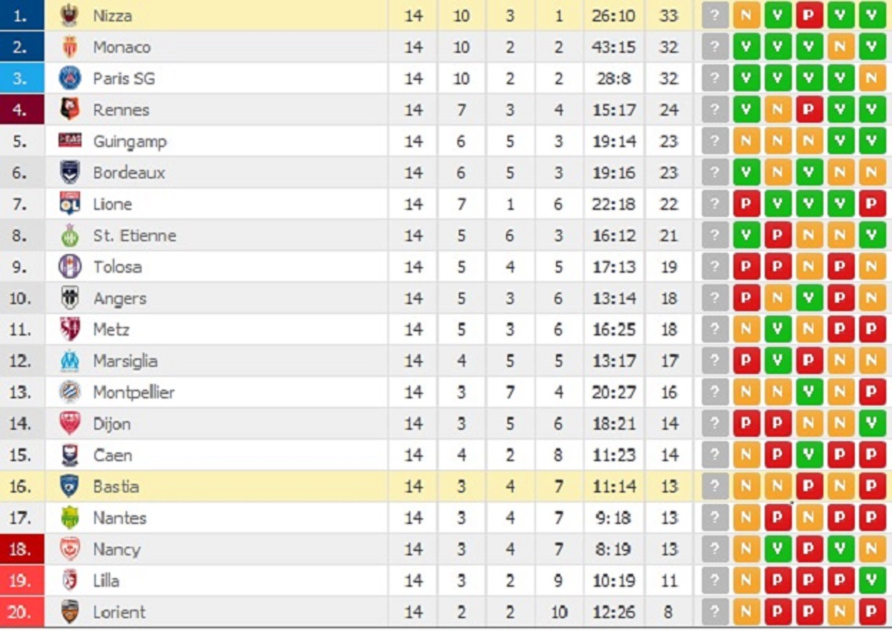 E’ terminata con la vittoria dei parigini al Parco OL la 14esima giornata di Ligue 1, che vede il Nizza ancora in testa, con un vantaggio che però inizia ad assottigliarsi per davvero dopo il pareggio casalingo con il Bastia di Domenica.
