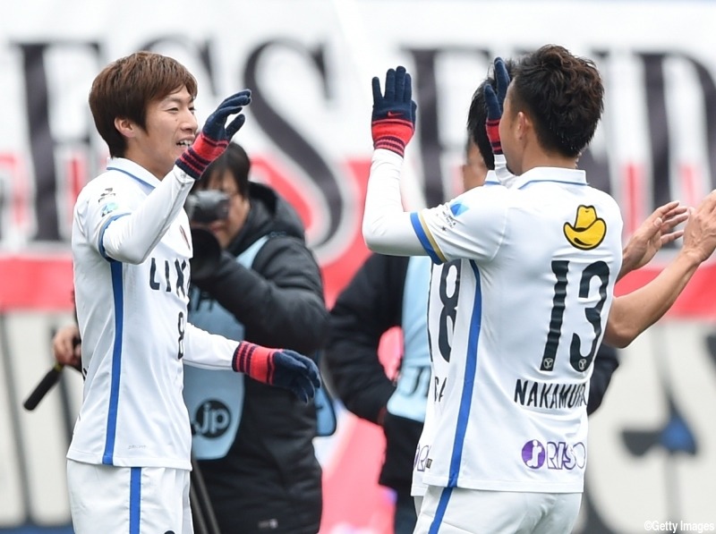 OSAKA, JAPAN - DECEMBER 29: (EDITORIAL USE ONLY) Shoma Doi of Kashima Antlers celebrates the opener with Atsutaka Nakamura of Kashima Antlers during the 96th Emperor's Cup semi-final match between Yokohama F. Marinos and Kashima Antlers at the Yammer Stadium Nagai on December 29, 2016 in Osaka, Yokohama, Kanagawa, Japan. (Photo by Kaz Photography/Getty Images)