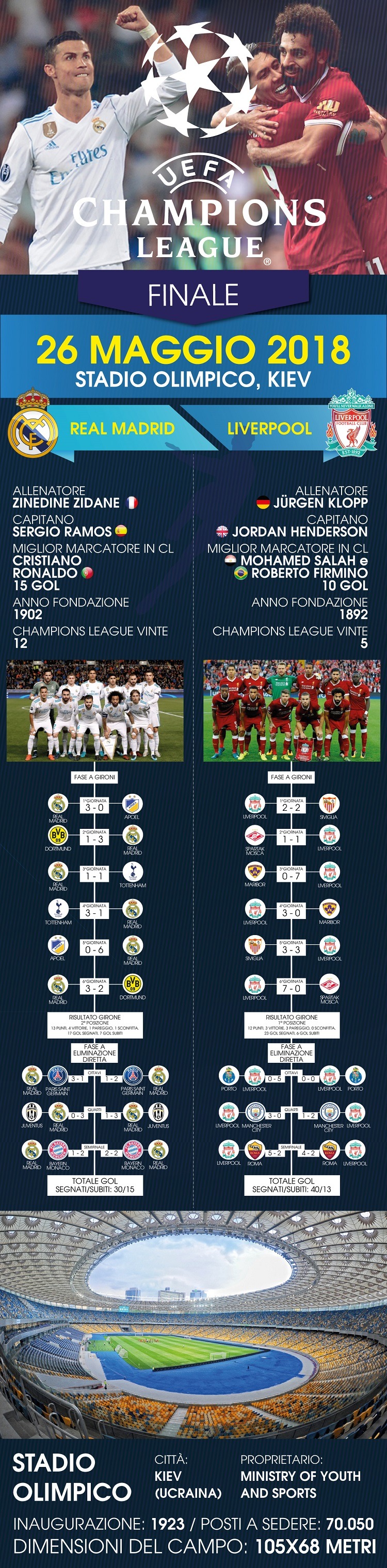 Ronaldo contro Salah, Zidane contro Klopp, il club più vincente nella storia della Champions League contro quello che nella massima competizione continentale ha trovato le maggiori soddisfazioni negli ultimi 20 anni: Real Madrid-Liverpool sarà la finale di Champions League 2017-18 che si disputerà il prossimo 26 maggio allo Stadio Olimpico di Kiev.