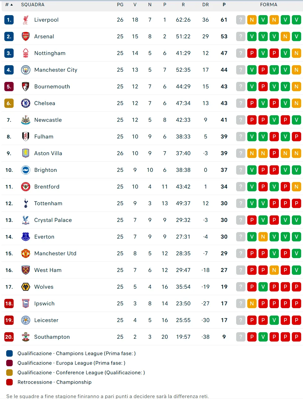 Il Liverpool dovrà guardarsi non solo dagli uomini di Guardiola, ma anche dall’Arsenal, che sabato avrà la possibilità di ridurre il distacco battendo il West Ham. La squadra di Mikel Arteta ha mantenuto una regolarità impressionante, conquistando 23 punti sugli ultimi 27 disponibili. Il vero nodo resta l’assenza di un attaccante di ruolo per il resto della stagione, ma finora i Gunners hanno trovato il modo di compensare questa lacuna.
