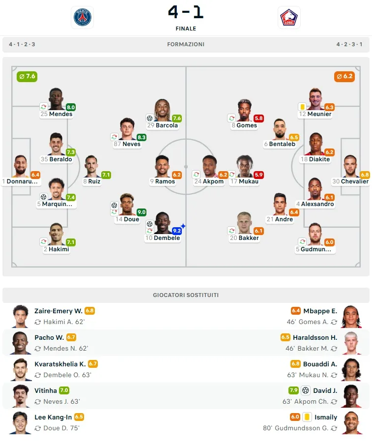 Con il punteggio in cassaforte, Luis Enrique ha optato per una gestione oculata, inserendo Zaïre-Emery, Pacho, Kvaratskhelia e Vitinha al posto di Achraf, Mendes, Dembélé e Neves. Il Lille, ormai rassegnato, ha trovato il gol della bandiera con Jonathan David, bravo a ribadire in rete una respinta di Donnarumma su tiro di Ethan Mbappé.