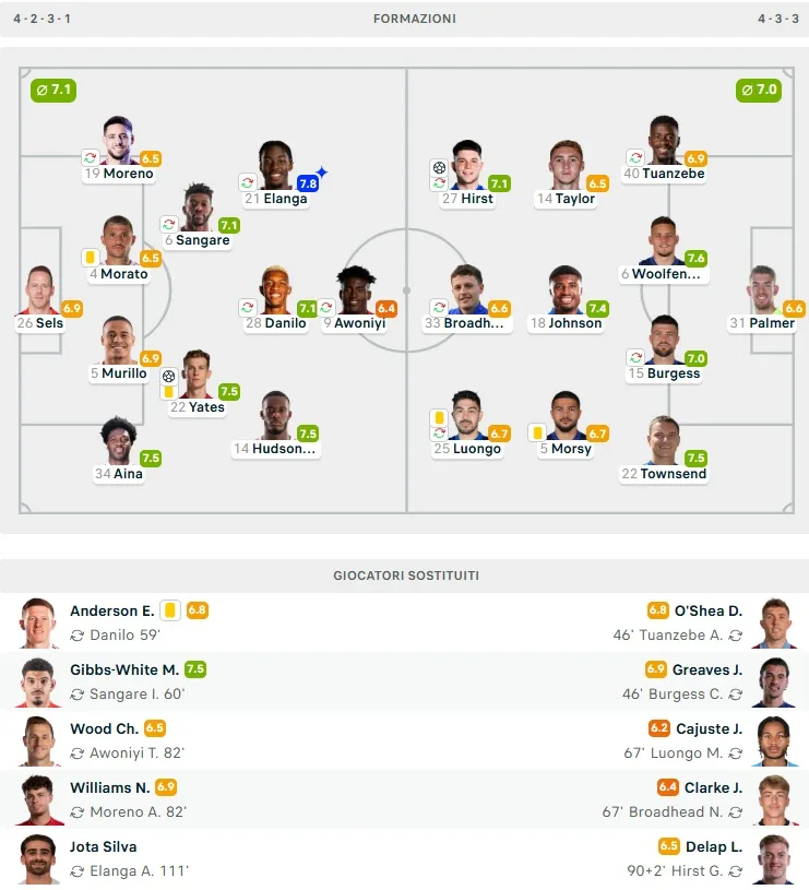 Scosso dallo svantaggio, il Forest ha accelerato i ritmi e al 68′ ha ristabilito la parità con un colpo di testa preciso di Ryan Yates, su assist di Anthony Elanga. L’entusiasmo ritrovato non è bastato per completare la rimonta nei 90 minuti regolamentari, con il match che si è trascinato ai supplementari senza altri squilli decisivi. La stanchezza ha preso il sopravvento, con entrambe le squadre incapaci di trovare il colpo del k.o.