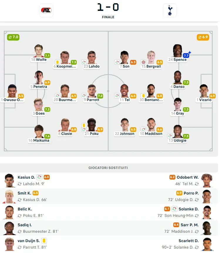 Nonostante il predominio territoriale, l’AZ ha tenuto aperta la qualificazione con una gestione più prudente nella ripresa. Il Tottenham, però, non ha saputo approfittarne, confermando i limiti visti nelle ultime settimane in Premier League.
