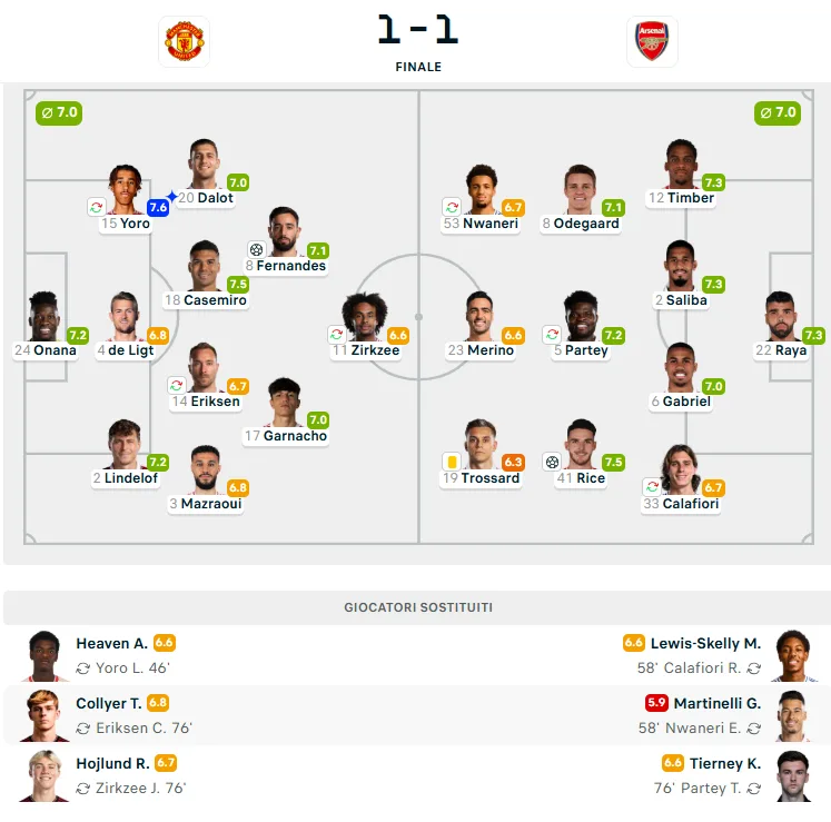 Nel finale entrambe le squadre cercano il colpo decisivo. Gabriel Martinelli va vicino al sorpasso, ma Onana si oppone con i pugni. Dall’altra parte, Gabriel Magalhães e Rice murano in extremis Rasmus Højlund, mentre Raya nega la doppietta a Fernandes con un riflesso straordinario nei minuti di recupero.