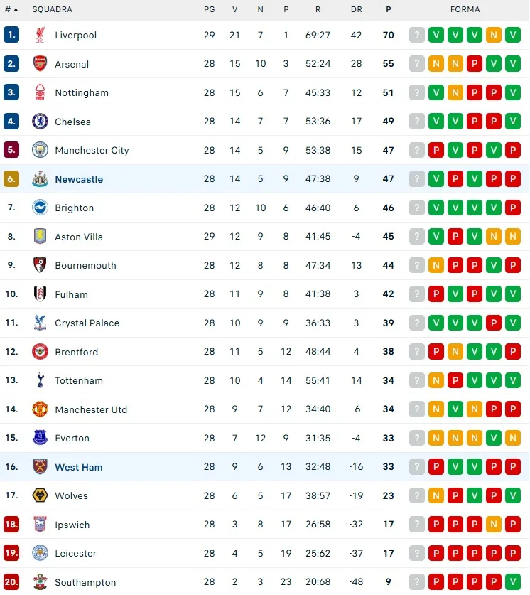 L’assalto finale del West Ham è generoso ma sterile. Il Newcastle difende con ordine e porta a casa tre punti fondamentali. La classifica si fa incandescente: con il Liverpool in fuga, la battaglia per la Champions coinvolge Arsenal (55 punti), Nottingham (51), Chelsea (49), Manchester City (47), Newcastle (47), Brighton (46), Aston Villa (45) e Bournemouth (44). E con dieci giornate ancora da giocare, ogni errore potrebbe rivelarsi fatale.