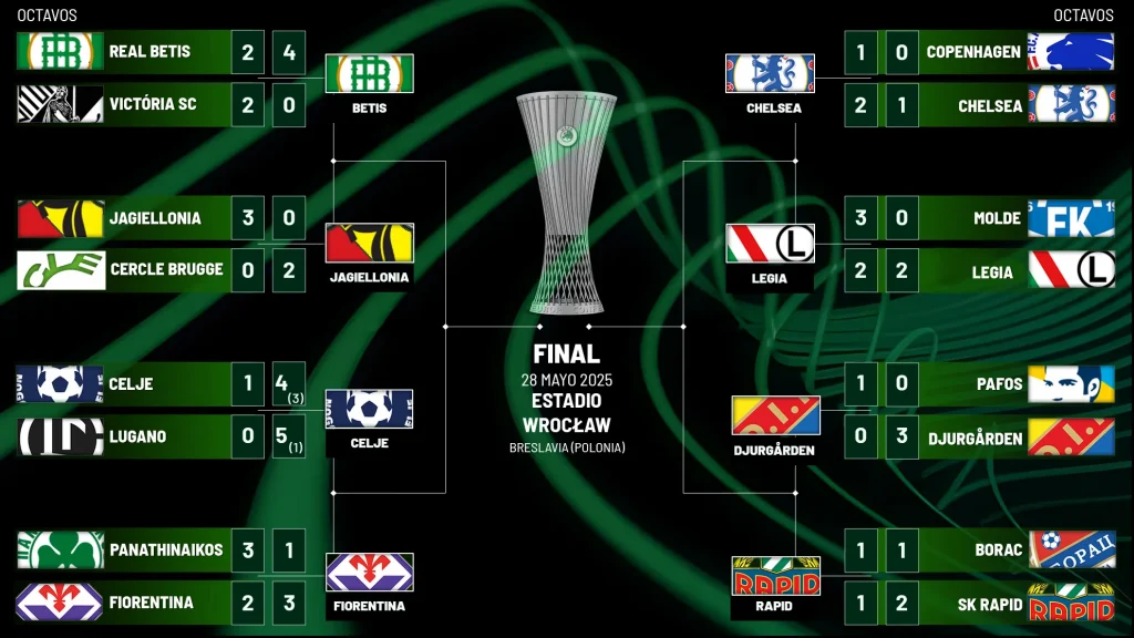 Le otto squadre arrivate fino a questo punto hanno dovuto superare avversari ostici negli ottavi di finale. Il Chelsea ha eliminato il Copenhagen con un netto 3-1, mentre il Betis Siviglia ha dominato il Vitoria Guimarães con un roboante 6-2. Più sofferta la qualificazione della Fiorentina, che ha avuto la meglio sul Panathinaikos dopo una battaglia da nove gol complessivi (5-4). Stesso discorso per il Celje, capace di superare il Lugano ai calci di rigore dopo un incredibile 5-5 complessivo.